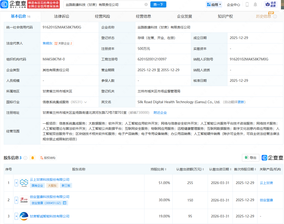 近日,丝路数康科技(甘肃)有限责任公司成立配资之家门户网站,法定代表人为焦晓东,经营范围包含:大数据服务;软件开发;人工智能应用软件开发;人工智能理论与算法软件开发;人工智能公共数据平台等。企查查股权穿透显示,该公司由云上甘肃科技股份有限公司、创业慧康(300451)等共同持股。